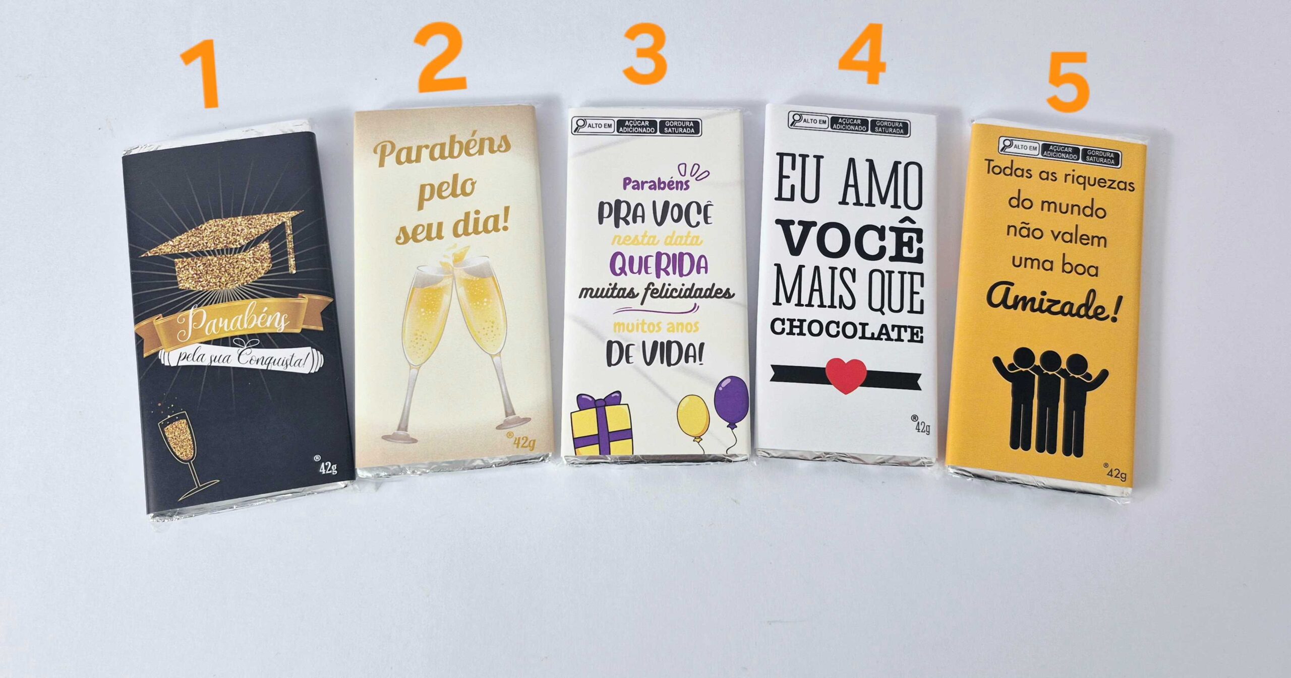 Cartão De Chocolate | 1- Formatura, 2- Parabéns pelo, 3- Parabéns pra você, 4-Eu Amo Você, 5- Amizade |