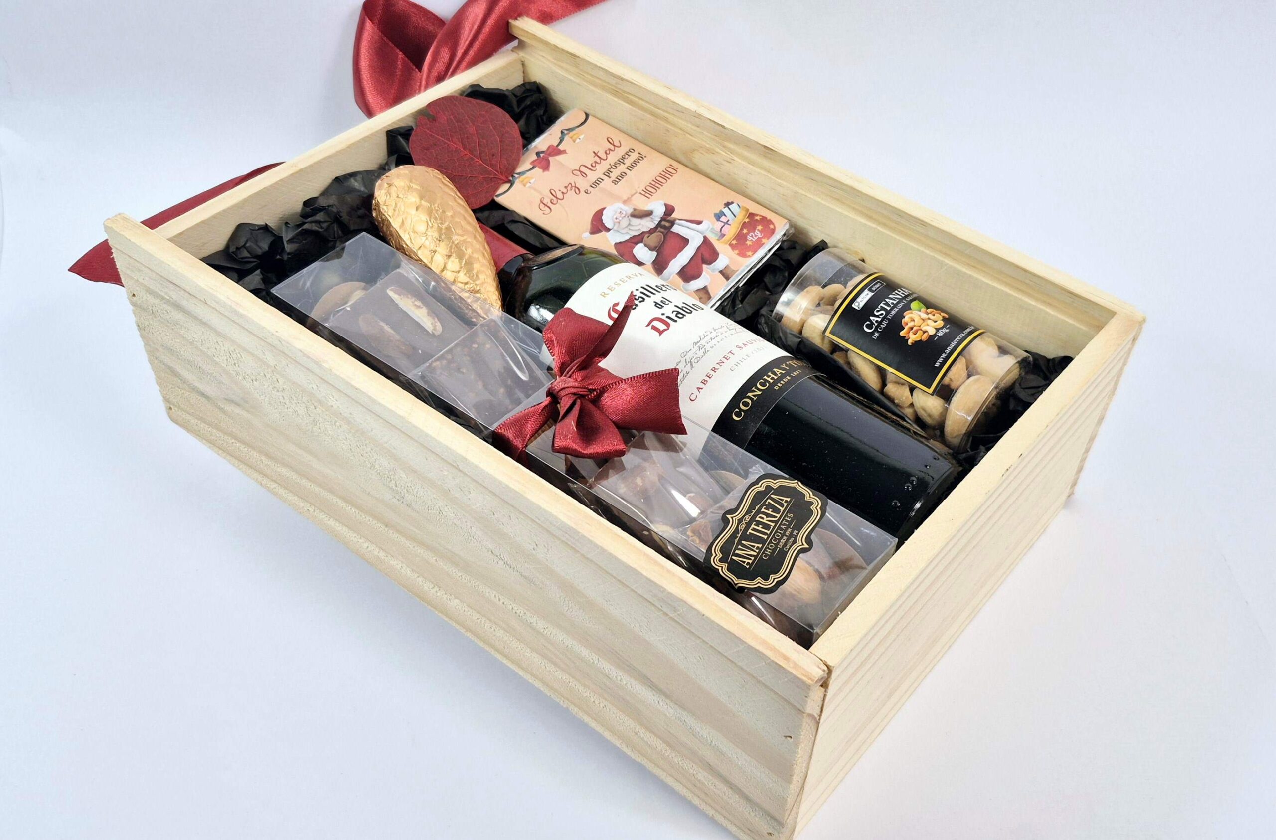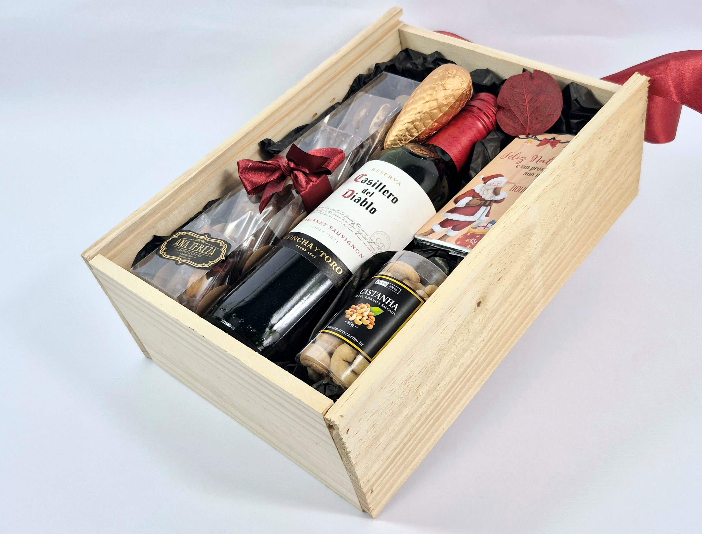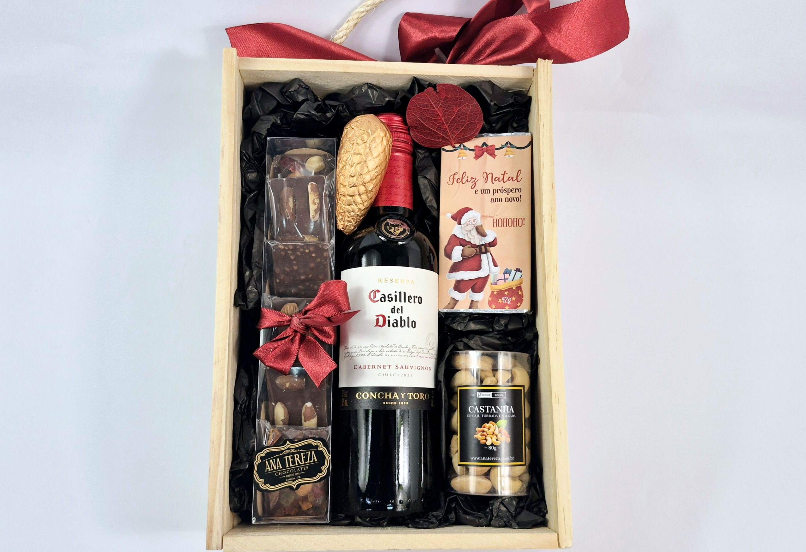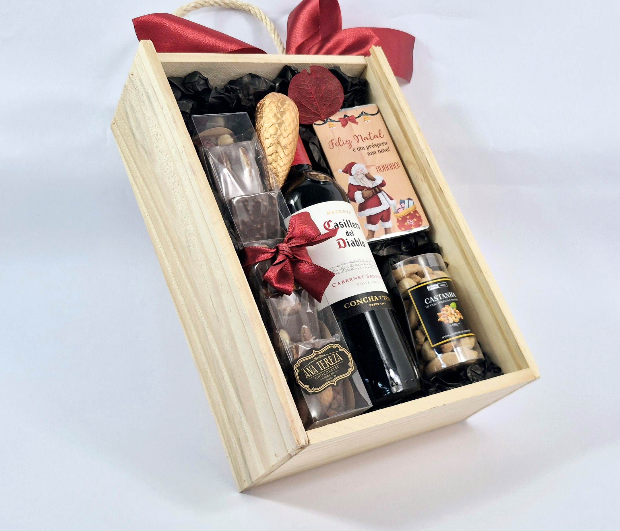 Caixa de Madeira contendo: 01 caixa com 06. barrinhas recheados + 01 barra de chocolate 42g feliz natal + 01 Pode com Castanhas de Caju salgada 80g+ 01 Vinho Casillero del Diablo (médio) 375ml