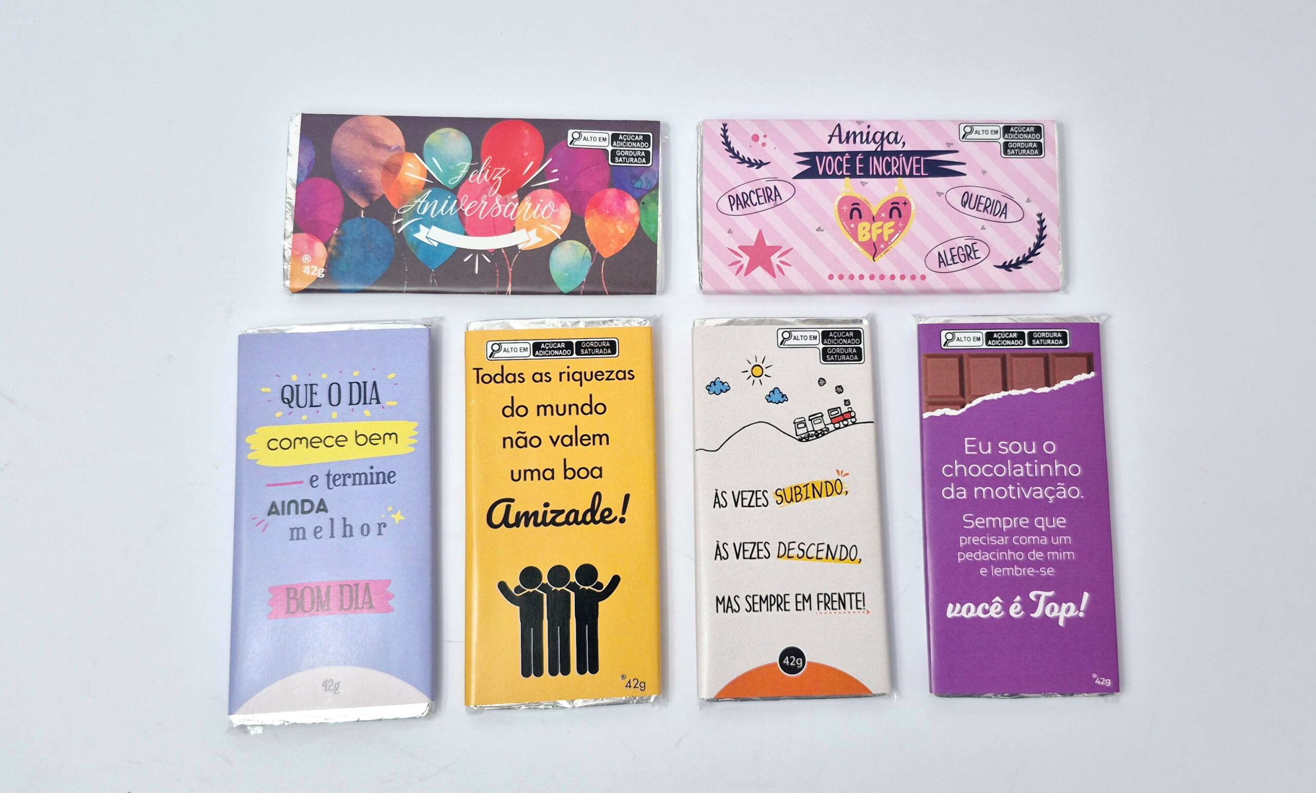 Cartão de Chocolate | 1- Feliz Aniversário, 2- Amiga, 3- Bom dia, 4- Amizade, 5- Sempre em Frente, 6- Você é top |