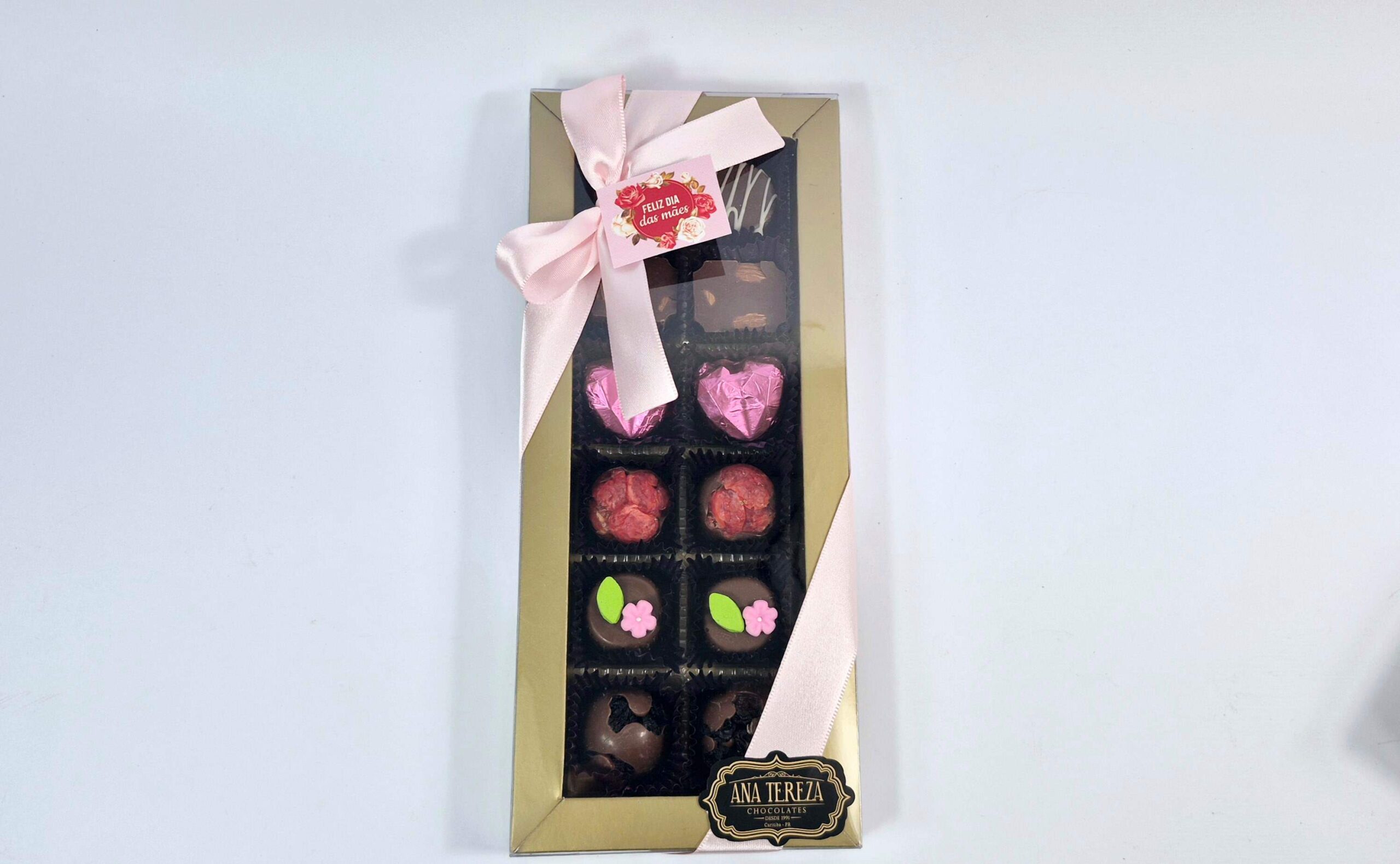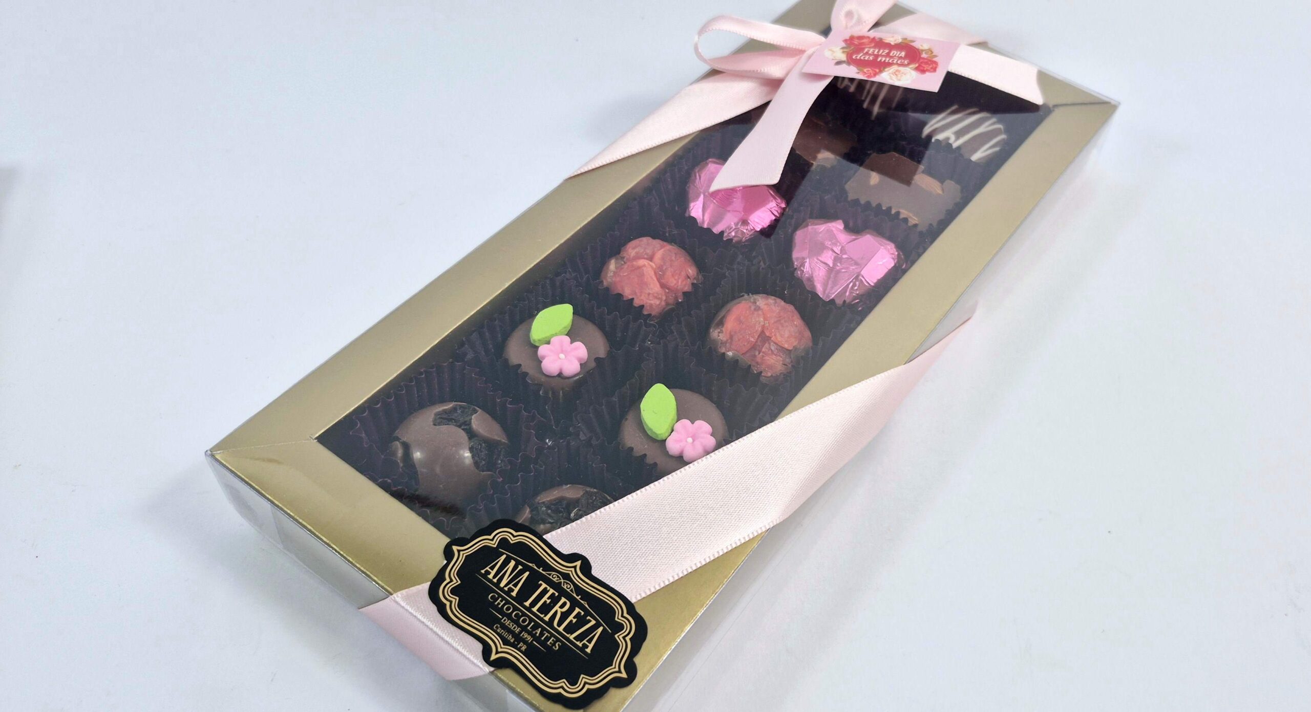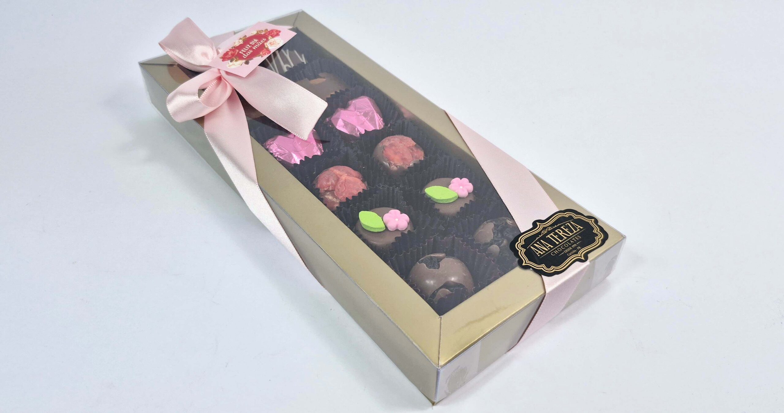 Embalagem: Caixa dourada + tampa transparente + fita rosa + tag dia das mães.